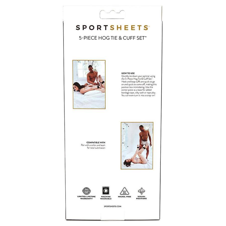 Specifications: four adjustable cuffs with Velcro closures, connect to a heavy duty metal O-ring or can be clipped together for limitless positions. Sturdy yet easy to remove, this kit creates quick and easy ways to restrain your partner. Includes: 4 soft, sturdy cuffs with easy on, easy off Velcro closures, 1 metal ring connector. Materials: Polypropylene webbing, nylon webbing, nickel free hardware, Velboa fabric, Velcro. The 5 Piece Hog Tie & Cuff Set can be used in the front or behind the back depending on the type of sex play you wish to have. Sturdy yet easy to remove, this product creates quick and easy ways to restrain your partner. Sportsheets keeping couples connected. Limited Lifetime Warranty, Sportsheets will replace any defective product. If the product is not available, Sportsheets will replace it with a similar product of similar function. Video. New images. 2021.