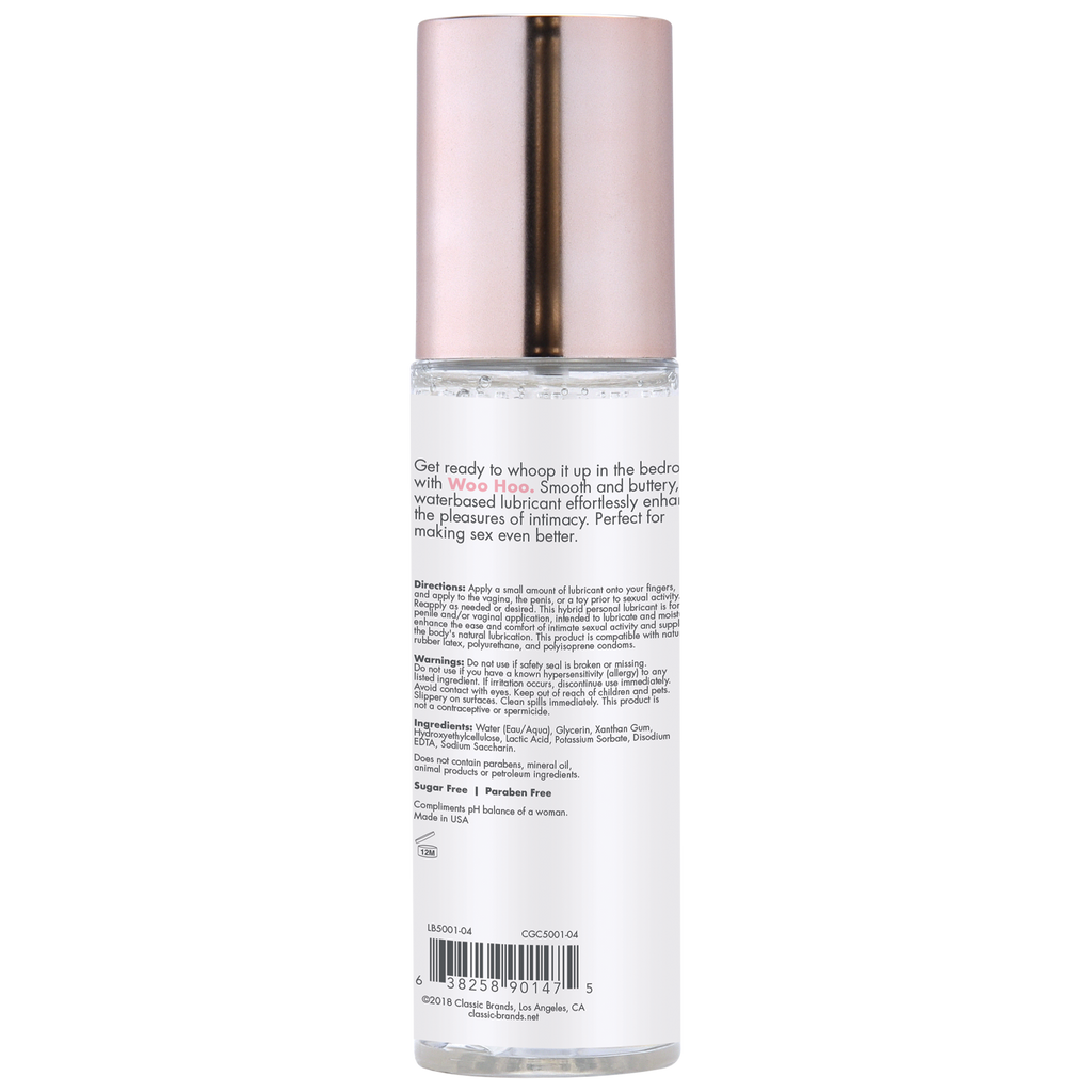 CGC Woo Hoo Personal Lubricant 4.4 fluid ounces from Classic Erotica. Get ready to whoop it up in the bedroom with Woo Hoo. Smooth and silky, this fusion of silicone and water prolongs the pleasures of intimacy with the ease of a non-fuss clean up. Perfect for making sex last even longer. How to use: apply a small amount of lubricant onto your fingers, and apply to the vagina, penis, or a toy prior to sexual activity. Reapply as needed or desired. This personal lubricant is for penile and/or vaginal application, intended to lubricate and moisturize, enhance the ease and comfort of intimate sexual activity and supplement the body's natural lubrication. Warnings: do not use if safety seal is broken or missing. Do not use if you have a known hypersensitivity allergy to any listed ingredient. If irritation occurs, discontinue use immediately. Avoid contact with eyes. Keep out of reach of children and pets. Slippery on surfaces. Clean spills immediately. This product is not a contraceptive or spermicide. Smooth and silky lubricant, ideal for prolonging pleasures of intimacy. Compliments pH balance of a woman. Fragrance free. Sugar free. Ideal for toy, self and couple's play. Fusion of silicone and glycerin provides longer glide with ease of a no fuss clean up. This product does not contain parabens, mineral oil, petroleum or animal products. Ingredients: Water, Cyclopentasiloxane, Glycerin, Dimethiconol, Paullinia Cupana Seed Extract, Ginkgo Biloba Leaf Extract, Hydroxyethylcellulose, Arginine, Xanthan Gum, Lecithin, Sclerotium Gum, Phenoxyethanol, Potassium Sorbate. Made in the USA.