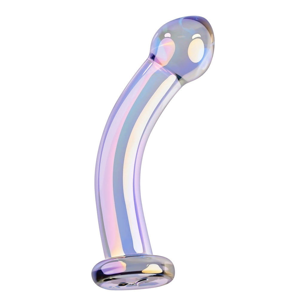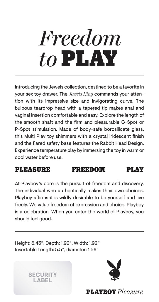 Playboy Jewels King Glass Probe from Evolved Novelties. Freedom to Play: introducing the Jewels collection, destined to be a favorite in your sex toy drawer. The Jewels King commands your attention with its impressive size and invigorating curve. The bulbous teardrop head with a tapered tip makes anal and vaginal insertion comfortable and easy. Explore the length of the smooth shaft and the firm and pleasurable G-Spot or P-Spot stimulation. Made of body safe Borosilicate Glass, this Multi Play toy shimmers with a crystal iridescent finish and the flared safety base features the Rabbit Head Design. Experience temperature play by immersing the toy in warm or cool water before use. Panel details: Play with me key features: shatter resistant Glass, deeply curved Multi Play Toy. No vibration. Material: Borosilicate Glass. Waterproof and submersible. 5 years Warranty. Size specifications: height 6.43 inches, depth 1.92 inches, width 1.92 inches. Insertable length 5.5 inches, diameter 1.56 inches. Categories: Anal Toys, Prostate Massagers, P-Spot Stimulators, Probes, Sticks, Rods, Dildos, Dongs, G-Spot. 2024.
