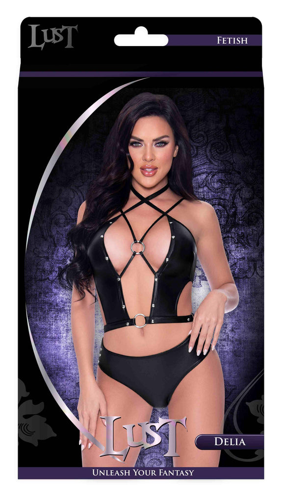 Lust Fetish Delia Black L/XL from Magic Silk Lingerie. From the Lust Fetish collection by Magic Silk, this style includes a Criss Cross Tank and Booty Boy Shorts Set featuring, Nickel Plated Rings, Back Clips and Studs, Adjustable Shoulder Straps and a Plush Elasticised Halter Neck with Clip Closure for comfort. Fabric description: distinctive leather look fabric featuring four way stretch and nickel plated studs. Fabric conent: 85% Polyester, 15% Spandex. Care: hand wash separately, cold water, line dry. Do not bleach. Lust Fetish set includes bra and matching shorts. Ladies sizes L/XL large and extra large. Dress sizes 12 to 18. Categories: Lingerie, Clothing, Bondage, Fetish, Kink, Bra Sets, Naughty Role Play, Women's Underwear. New package image added. 2023