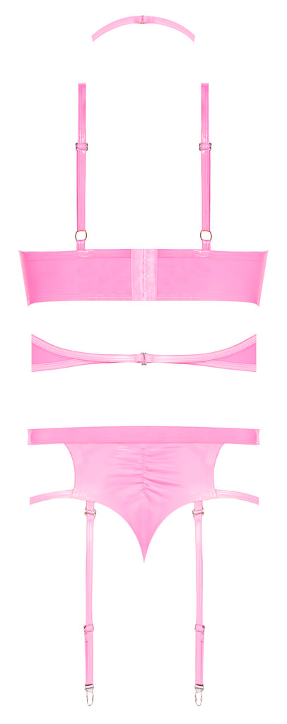 Club Candy Bra, Harness and Panty Pink 2XL from Magic Silk Lingerie. From the Exposed by Magic Silk collection, this style includes: a demi bra featuring hook and eye closure in the back with an attached collar harness, clear o-ring details throughout and a matching panty with an attached garter. Sweet Bubblegum pink meets slick and slippery wet look fabric. Fabric content: 55% Polyurethane, 40% Polyester, 5% Spandex. Care instructions: hand wash cold water. No bleach. Dry flat. Ladies plus size 1X/2X. Dress sizes 20 and 22. Categories: Lingerie, Clothing, Bra Sets, Naughty Role Play, Plus Sizes, Women's Underwear. 2023.