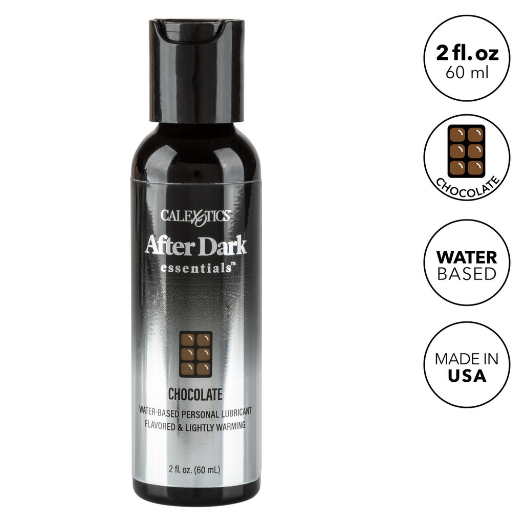 After Dark Essentials Chocolate Lube 2 ounces from California Exotic Novelties. Indulge in a truly delicious playtime experience when you grab the After Dark Essentials Chocolate Flavored Personal Lubricant. The premium water based formula is infused with 100% edible flavoring with an arousing light warming effect. The super slick lubricant enhances natural lubrication, moisturizes and leaves skin lickable soft. The light warming effect is made to arouse the senses and provide a pure, erotic stimulation to enhance your oral experience. Expertly created by the sexual health experts at Cal Exotics, the water based formula is pH friendly, safe for all skin types, and free from artificial fragrances and colorants. Made in the USA. How to use: use as needed to enhance intimacy and lubricate pleasure. Apply a small amount of flavor infused lube to desired area to lubricate, reapply as needed. Easily washes away with warm water. Color Clear. Measurements 2 fluid ounces. Weight 3.1 ounces. Package 1.25 inches by 1.25 inches by 4.56 inches.