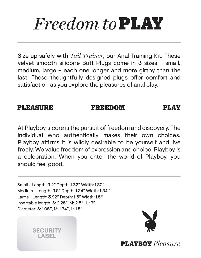 Playboy Tail Trainer 3 Piece Set from Evolved Novelties. The freedom to play is yours with Playboy Pleasure. Size up safely with Tail Teaser, Playboy Tail Trainer Anal Training Kit. These velvet smooth Silicone Butt Plugs come in 3 sizes: Small Butt Plug, Medium Butt Plug, Large Butt Plug. Each one longer and more girthy than the last. Perfect for beginners, the slender shafts are flexible and easy to insert. Grooves in each plug add extra enjoyable stimulation. These thoughtfully designed plugs offer comfort and satisfaction as you explore the pleasures of anal play.