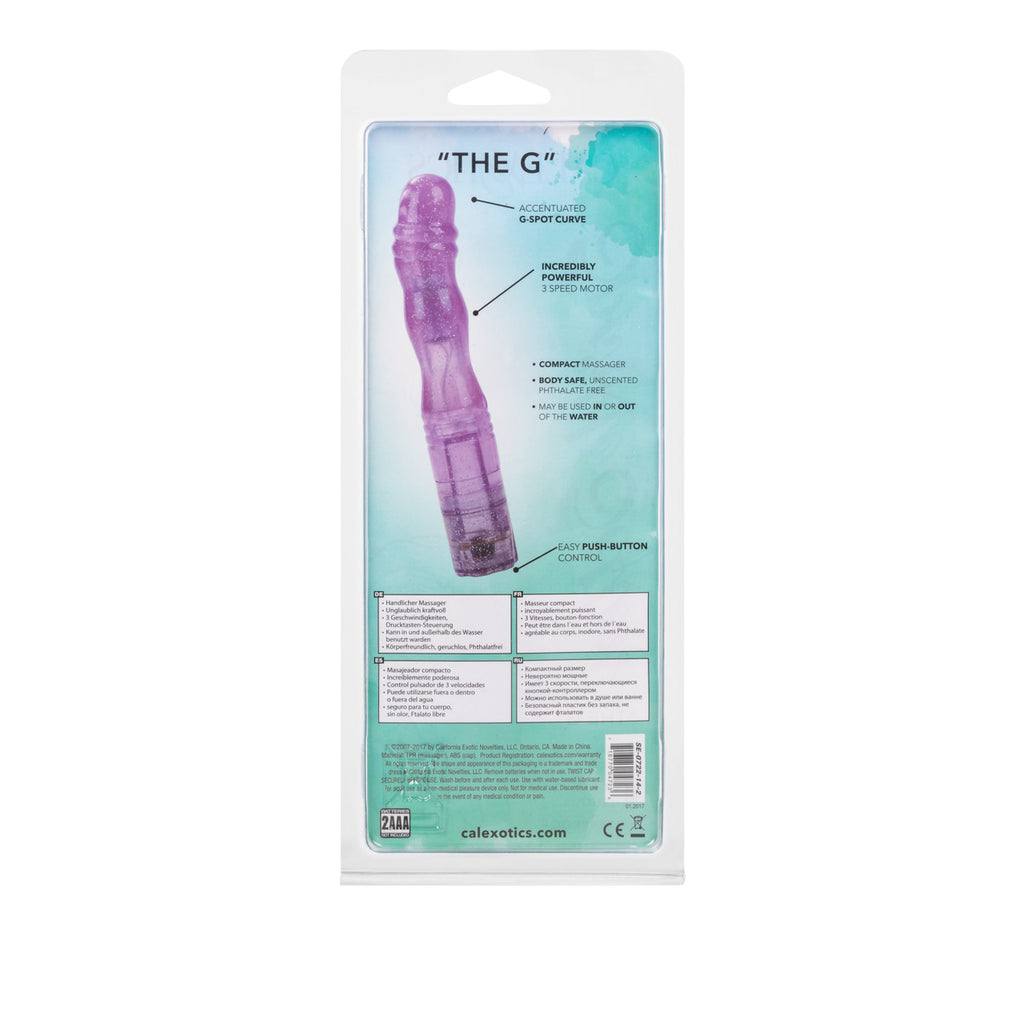 Sparkle Softees Purple Vibrator The G from California Exotic Novelties. The exotic Sparkle Softees G stimulator is ultra sensuous, super soft and perfect for intimate arousal and ultimate pleasure. The multi-speed stimulator has a flexible, contoured shaft and undulating pleasure ridges for your ultimate sensual satisfaction. The glittery personal massager is waterproof and ideal for exciting arousal and stimulation, in or out of the water. The soft and super sensual vibrator is made from hygienically superior Thermoplastic Rubber TPR and has a Sparkling Glitter Finish and Durable ABS Plastic End Cap. The versatile, easy to use stimulator is sensually contoured and measures 5.25 inches by 1 inch and has a flexible shaft with smooth rounded angled tip, for optimal G-Spot stimulation. The power packed vibe runs on 2 AAA batteries and has push button controls, for easy internal and external sweet spot exploration. The waterproof teaser is ideal for first time and experienced users, and suitable for thrilling solo play in the shower, bath or hot tub fun. Indulge your secret fantasies, or invite your lover to join in the erotic fun. For intensified pleasure and heightened orgasmic satisfaction, always use a quality lube with this toy. Clean the G-Spot Vibrator before and after every use. Wash the sensually contoured stimulator in warm, soapy water, or clean with a toy cleaner spray. Superior quality! Soft and sensuous, waterproof vibrations. 3 speed power packed glittered massagers with convenient push button control. Safe and pure for body and pleasure. Made using phthalate free, non-toxic materials: Unscented Thermoplastic Rubber TPR Shaft, ABS Plastic Base. Vibrator measures 5.25 inches long by 1 inch wide. Weighs 3.2 ounces. Vibrating sex toy requires 2 AAA batteries, not included. Do not leave batteries in the vibrator between uses. A water based lubricant is recommended. Sparkle Softees is a registered trademark for California Exotic Novelties. Sex toys and sexual wellness. Categories: Vibrators, G-Spot, Sex Toys for Women, G-Spot Flexible Vibrators. 2023.