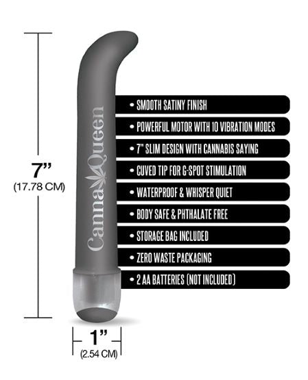 Prints Charming Buzzed 7 inches G-Spot Vibe Blazing Beauty Pink from Global Novelties. Smooth satiny finish with powerful motor and 10 vibration modes. 7 inches slim design with cannabis themes and a curved tip for G-Spot stimulation. Waterproof and whisper quiet, body safe and phthalate free materials ABS Plastic Shaft with Silicone Buttons. Storage bag included, zero waste packaging, Vibrator requires 2 AA batteries, not included.