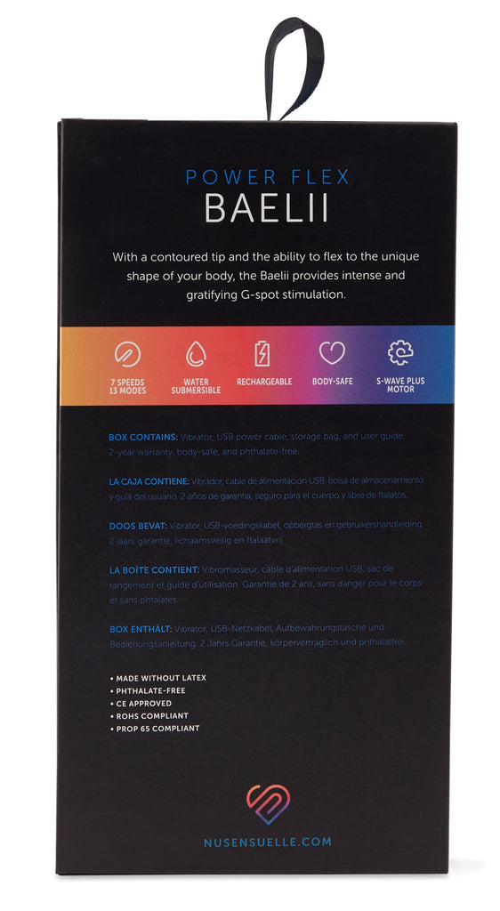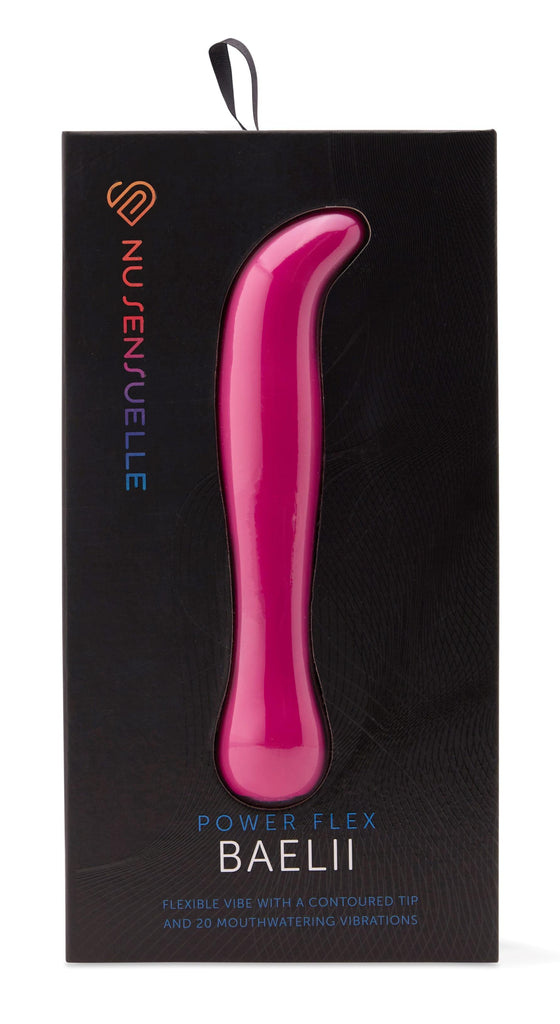 Sensuelle Bael II  20 functions of vibrations. Flexible silky smooth powerful curved tip sex toy. USB Rechargeable. Charge time 4 hours. Run time 1 hour. Material Silicone. Waterproof vibrations. 100% submersible. 1 year warranty. Wall charger not included. USB cable only.