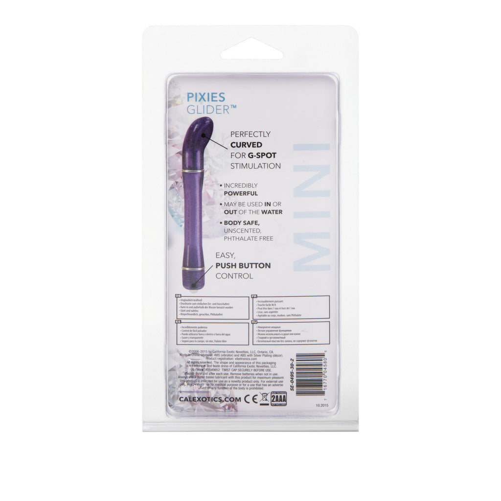 Waterproof Pixies Glider Vibrator. Power packed petite, waterproof vibrating massager glides across your body for precise pleasure. Made with durable and easy to clean plastic, this massager has a sparkling shimmer while the contoured shape supplies total stimulation.The large head is curved slightly and shaped like a spoon, with a smooth rounded-back and flat front. This flat front features a small divot to cradle the clitoris or nipples for tickling and teasing fun. Both sides of the head can be used for massaging pleasure and the wand-like design makes it easy to control and grip. A single push button activation directs the vibrations and the waterproof construction makes it fun in the shower or bath. Safe and pure for body and pleasure. Made using phthalate free, non-toxic materials ABS plastic. Vibrator measures 5 inches long by .75 inch wide. Requires 2 AAA batteries not included. Do not leave batteries in the vibrator between uses. A water based lubricant is recommended. Always clean before and after use. Category: For Women, Vibrator, Vibrators. Pixies Vibes hold the US Patent number D450952. Waterproof Pixies Glider Vibe is a registered trademark for California Exotic Novelties. Sex toys and sexual wellness. 16.