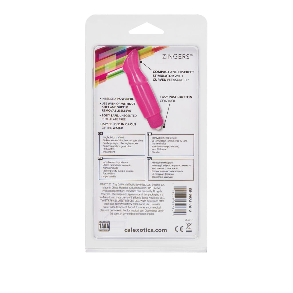 Zinger Pink Vibrator from California Exotic Novelties. Get the Zingers waterproof personal massager for the ultimate female stimulation and take it with you everywhere you go. This travel sized, compact bullet vibe is the perfect device for personal moments either at home or away, and it features a unique textured head for the most amazing, sexy sensations. Made with a removable Thermoplastic Rubber TPR sleeve with a toe curling nubby head, and an easy push button control for easy handling from any position, this bullet massager is a must have for your personal adult toy collection. Whether you are looking for a starter product that is fully waterproof for wet and wild fun, or you need something discreet and compact to use as a handy travel accessory, this beginner sex toy will bring you sensual pleasure every time. It is small, simple and easy to use! The soft and supple design means that it is ideal for any part of your body and feels amazing on your skin, and the powerful vibrations will take your massage to a whole new level. It measures 3.25 in length, and 1 inch long and the nubby sleeve can be removed completely so you can use the bullet vibe independently for a totally different experience. The Zingers waterproof massager comes in a fun and stylish pink, making it a great gift for a lover or a fabulous treat for yourself. It is safe to use all over and a great product to take into the shower. Waterproof, powerful, soft and supple mini massagers with easy to operate push button control. Made using phthalate free, non-toxic materials: unscented Thermoplastic Rubber TPR sleeve, ABS Plastic Bullet Vibrator. Requires 1 AAA battery not included. Sleeve on vibrator measures 3.25 inches long by 1 inch wide. Stimulator measures 2.5 inches long by .65 inch wide. 1 year warranty. Zinger is a registered trademark for California Exotic Novelties. Sex toys and sexual wellness. Categories: Vibrators, G-Spot Massagers, Sex Toys for Women, Vibrating Bullets and Eggs. 2023.