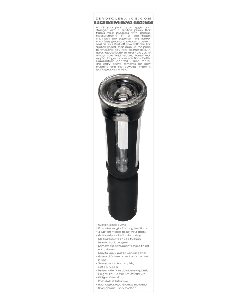 Zero Tolerance Rechargeable Penis Pump - Pump It Up from Evolved Novelties. Watch your penis grow bigger and stronger with a suction pump that tracks your progress with precise measurements in a see through chamber! The super soft Thermoplastic Elastomers TPE rubber entry feels great and creates a perfect seal as you start off slow with the first suction speed, then amp up the pace to wherever you feel comfortable. A quick release button makes sure you are always safe and secure. Pump your way to longer, harder erections, better ejaculation control and more. The entry sleeve removes for easy cleaning and the powerful motor is rechargeable via USB port. Zero Tolerance Rechageable Penis Pump - Pump It Up. Categories: Sex Toys for Men, Penis Pumps, Male Pumps, Rechargeable. 5 years warranty. New video. 2023.
